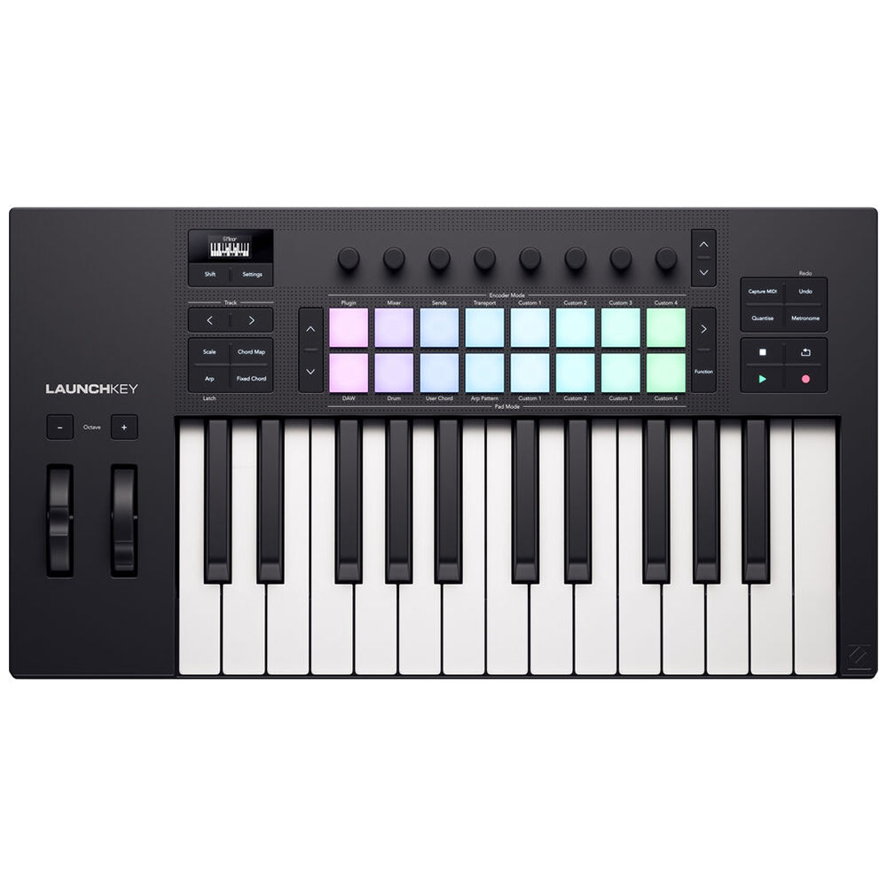 Further control features include buttons for pad page, scene launch, function, encoder page, capture MIDI, undo, quantize, and metronome, octave up and down, and full transport controls. View what chord you're playing in real time with the OLED display, lock the notes on your keyboard into a specific musical key, activate three chord modes (Fixed Chord, User Chord, and Chord Maps), and utilize the powerful and programmable internal arpeggiator. Versatile connectivity lets you connect to MIDI gear via 5-pin DIN, computers and smart devices via USB-C, and sustain pedals via 1/4". Like all Launchkey products, Launchkey 25 includes a suite of powerful software to facilitate creation right out of the box.