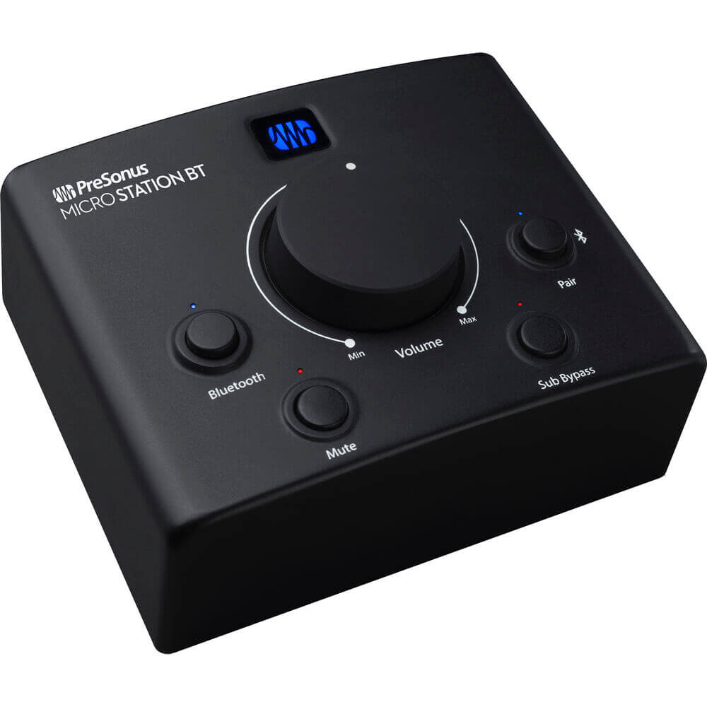 Effortlessly add both Bluetooth connectivity and a subwoofer output to any stereo monitoring setup with the PreSonus MicroStation BT 2.1 Monitor Controller with Bluetooth Connectivity, a compact and easy-to-use monitoring controller for critical listening and mixing applications. This device combines a Bluetooth receiver with a conventional monitor controller, giving you the ability to stream audio from any Bluetooth-enabled source straight to your 2.1 loudspeaker setup.