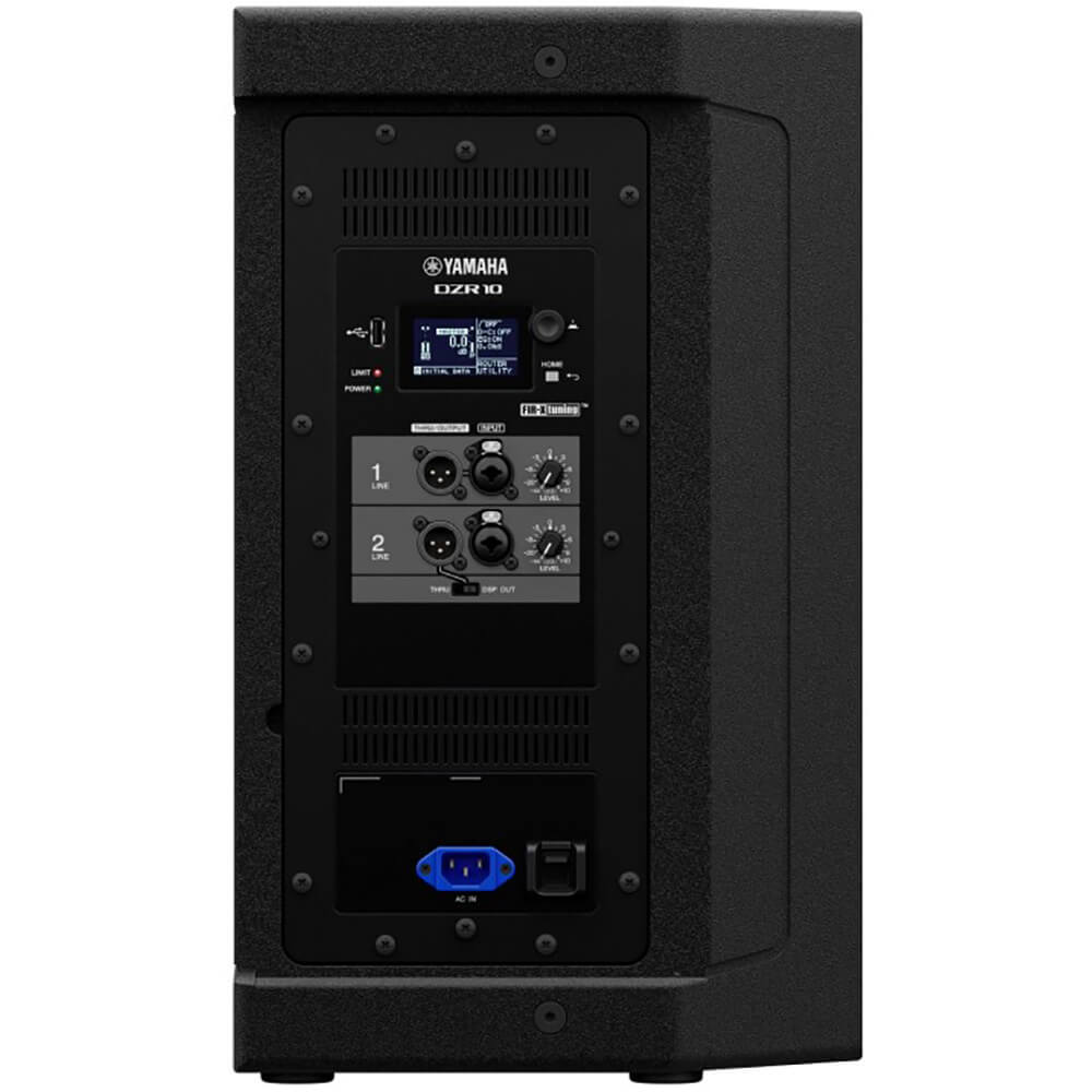 The rear panel offers two combo XLR-1/4" inputs with XLR thru/outputs and dedicated level controls. A USB port allows for system upgrades and preset configuration and backups. The Yamaha DZR10 ships with a standard IEC power cord.