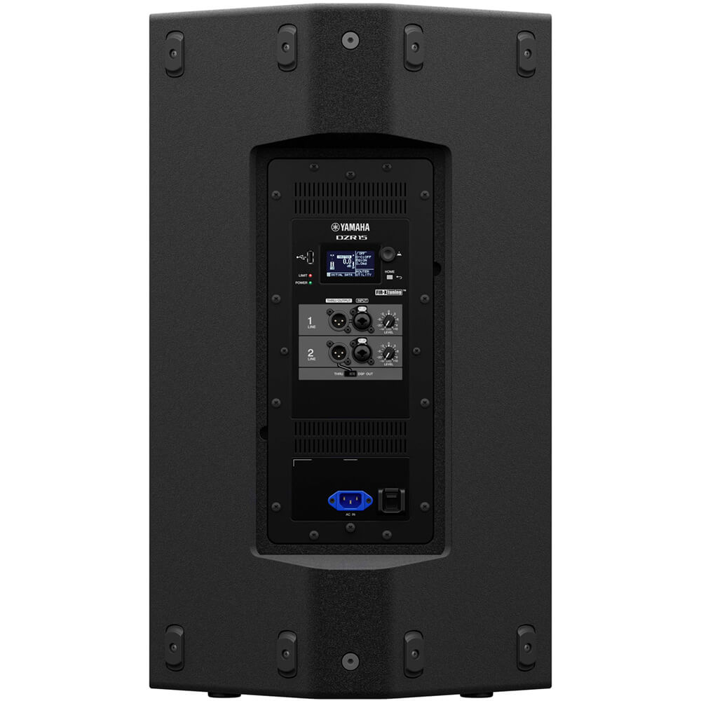The rear panel offers two combo XLR-1/4" inputs with XLR thru/outputs and dedicated level controls. A USB port allows for system upgrades and preset configuration and backups. The Yamaha DZR15 ships with a standard IEC power cord.