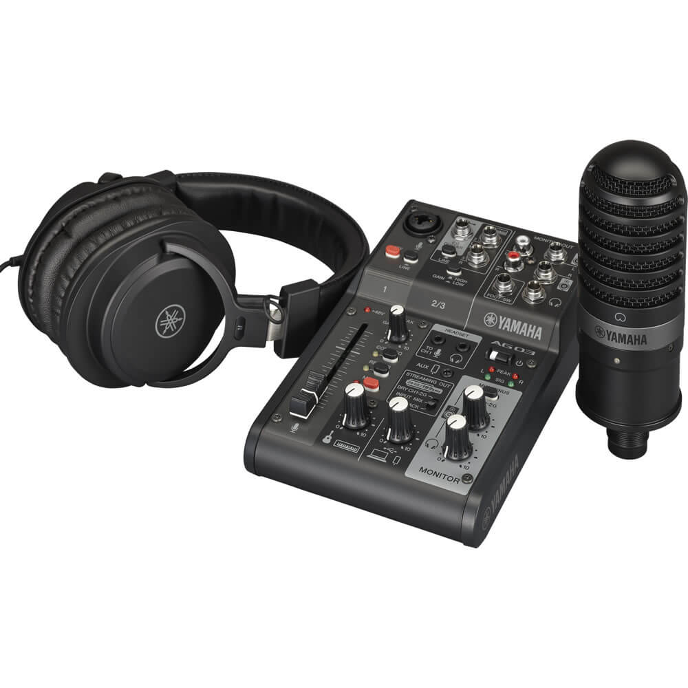 The Yamaha AG03MK2 3-Channel Mixer/Interface Live Streaming Pack bundles together a mixer, microphone, headphones, and cable for podcasting/streaming applications, voiceover work, and vocal recording with your Mac/Windows computer or iPhone.